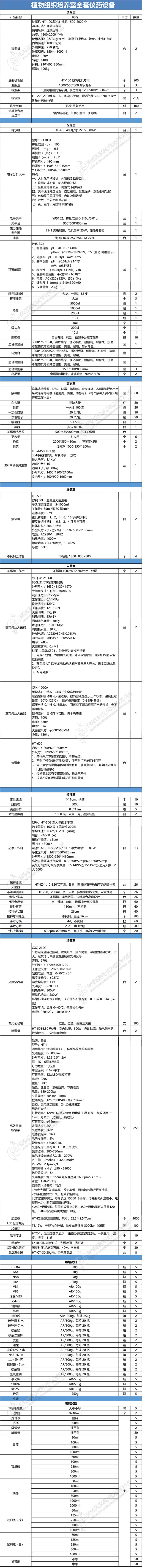 植物组织培养室全套仪药设备产品名称规格单位数量洗瓶机HT-100,每小时洗瓶1500-2000个,运动方式:间歇式旋转,使用条件:连续运转,效率:1500-2000个/h,使用水压:0.5-3kgF/cm²,刷瓶子时手动,转盘内冲洗时自动,内刷转速:1000转/分,外刷转速:750转/分,洗瓶规格:150ml-1000ml,电压:380...