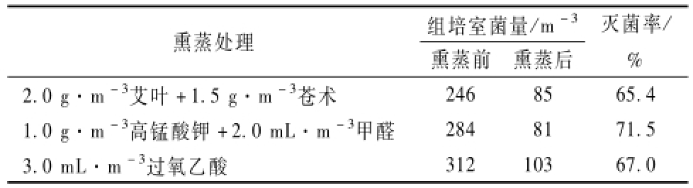 由表3可知,1.0 g.m-3高锰酸钾和2.0 mL. m-3甲醛熏蒸法总灭菌率为71.5%,灭菌后含菌量<90 m-3,2.0 g.m-3艾叶+1.5 g.m-3苍术联合熏蒸的总灭菌率为65.4%,灭菌后含菌量<90 m-3,灭菌效果均达到组培对空气质量的要求;3.0 m L. m-3过氧乙酸熏蒸总灭菌率为67.0%,灭菌后含菌量为103 m-3。前者灭菌效果好,后两者灭菌效果差异不大,但甲醛高锰酸钾与过氧乙酸对人体伤害极大,要慎用;而苍术与艾叶联合熏蒸法,对人体几乎无害,且2种药材来源广泛,价格便宜,是一种理想的空气灭菌替代品。