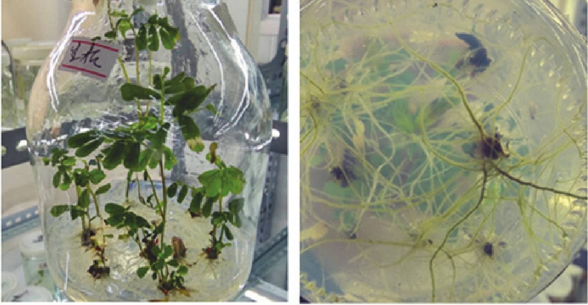 从表4可知,NAA对叶下珠丛生芽生长、生根作用不佳。添加NAA后,植株瘦小,茎下部长满红色愈伤组织,根呈白色绒毛状。IBA对叶下珠丛生芽生长、生根有明显促进作用,在IBA为0.5 mg·L-1时,丛生芽生长快,植株绿色,较粗壮、健康,根系发达,主次根明显(图1)。但随IBA浓度增加,丛生芽植株生长变缓,主次根区别不明显。因此,较适合丛生芽生根的培养基为1/2MS + IBA 0.5 mg·L-1+ 琼脂7.5 g·L-1 + 蔗糖20 g·L-1,此时丛生芽生长快,根系发达,生根率达100.00%。