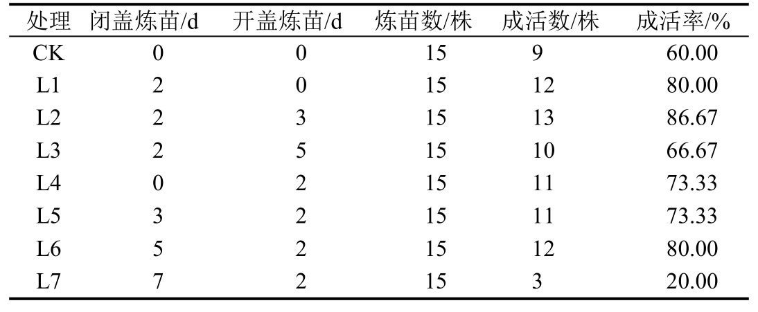1.2.7 炼苗 将生根的瓶苗转移至培养室外进行炼苗,处理时间设置见表5。炼苗后清水洗净根部培养基,移栽至加水拌成泥状的菜园土基质。栽培条件:自然光,气温25~30 ℃。移栽15 d后统计成活率。