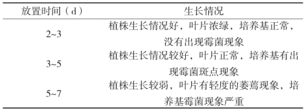 让瓶苗在自然环境中过渡到无菌苗直接接触自然环境的处理也非常重要,试验通过不同出瓶时间处理来观察铁皮石斛组培苗的生长情况,结果见表2。试验表明:揭盖2~3 d后出瓶的瓶苗变化不大,叶片颜色稍有变深,培养基无霉菌感染;揭盖3~5 d后出瓶的瓶苗植株虽然没有太大变化,但培养基会偶尔出现少数霉菌斑点;揭盖5~7 d后出瓶的瓶苗长势减弱,叶片有轻度的萎蔫现象,且培养基的霉菌现象加重。通过比较发现以出瓶2~3 d的处理效果好,这主要是由于培养基与外界空气接触时间短,从而使感染的病菌较少。