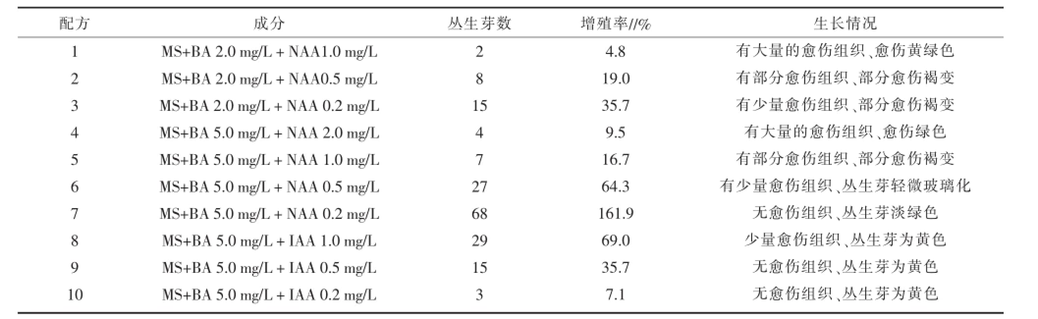 不同的培养基配方诱导出的丛生芽情况见表2。配方7的增殖率高,达161.9%,诱导处理后无愈伤组织出现,诱导出的丛生芽为淡绿色;其次为配方8和配方6,增殖率分别为69.0%和64.3%,有少量愈伤组织出现,丛生芽表现出轻微玻璃化和黄化现象;配方1和配方4有大量的愈伤组织出现,是适宜诱导愈伤的培养基配方;其他配方如配方2、配方3和配方5,虽然也能诱导出愈伤组织,但愈伤组织褐变,故不适宜作为诱导愈伤组织的培养基配方。适宜的培养基配方可以使空气凤梨子株诱导出较多的丛生芽,丛生芽表现良好,故诱导其丛生芽适宜的组培配方为MS+BA 5.0 mg/L+NAA 0.2 mg/L。