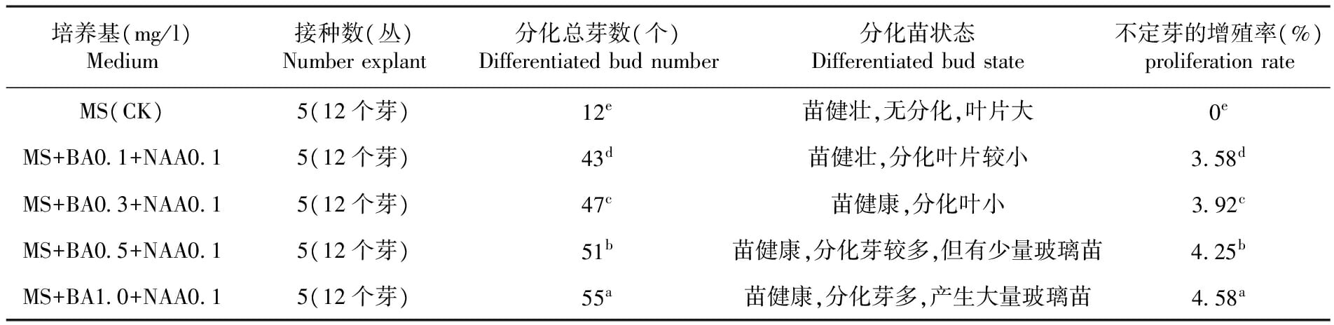 诱导出的无菌苗,接种于MS+NAA0.1 mg/L添加不同水平BA(0、0.1、0.3、0.5、1.0 mg/L)的培养基中,各接5瓶,每瓶接1株(丛)。每天光照12 h,光照强度为3 000~5 000 lx,培养温度24~28℃,接种30 d后统计增殖率。
