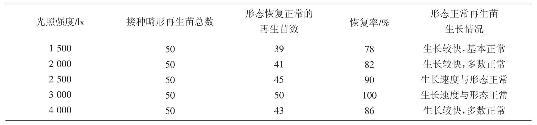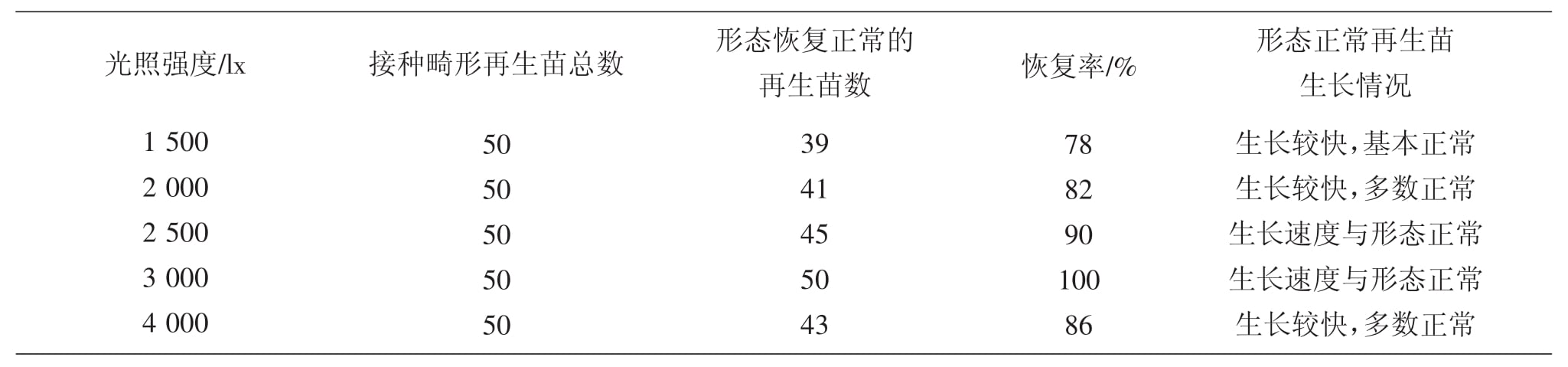从表2可以看出,冰灯玉露形态正常率较高,原因主要是由于试验采用的培养基为MS附加0.25 mg·L-1的BA,因此,组培苗形态普遍变得较为正常;但在不同温度下,形态正常苗的比例有所不同,当温度为20℃时,获得的形态正常的组培苗数多,而随着温度的增加,组培苗恢复率也逐渐下降,到28℃时,仅有38%。说明冰灯玉露形态建成培养的温度应采用较低的温度。在试验中,也曾采用18℃进行培养,但结果显示,几乎所有组培苗都停止生长,只有个别生长正常,说明过低温度也不利于冰灯玉露组培苗的形态建成。虽然在20℃时可以获得较高的冰灯玉露组培苗的恢复率,但也因温度较低,组培苗生长速度较慢,也不是理想的培养条件。为此,试验又采用不同光照强度来提高形态重建率,希望获得较高、较快的冰灯玉露形态重建培养。