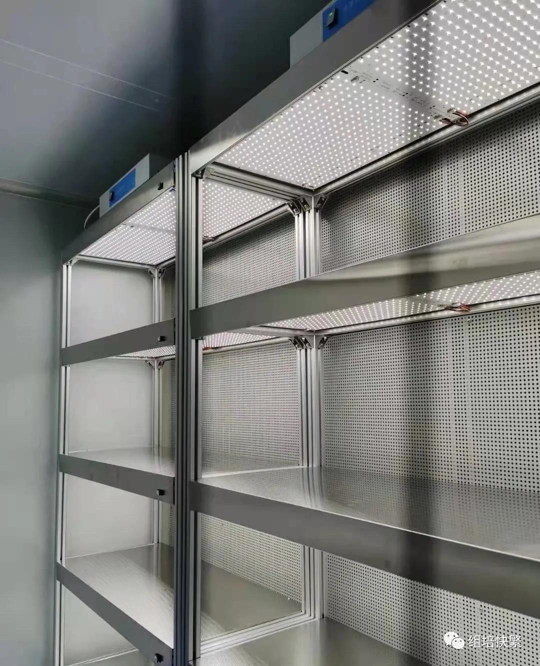采用欧标铝型材作为整体框架主材料,立柱规格:40×40*2mm,表面电泳处理。耐腐蚀。表面光洁度高,无毛刺,无需二次加工。每层置物板下方配备LED植物专用生长光源,使用寿命长,节能,光照均匀性好。置物板配备镜面不锈钢,耐腐蚀。每层置物板高度调节由四个角的滑块连接件进行松紧调节,无需额外螺丝孔,表面干净,美观,无毛刺不割手。置物板前部设有遮光系统,可以有效防止光照的逃逸从而造成实验人员的刺眼等损伤。每层置物板的右侧配备主光、辅光调光器,弱电,DC24V,供电安全。